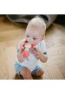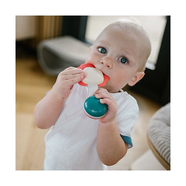 Η μαλακή σιλικόνη της κουδουνίστρας λειτουργεί και ως μασητικό, προσφέροντας ανακούφιση στα ευαίσθητα ούλα κατά την περίοδο της οδοντοφυΐας.