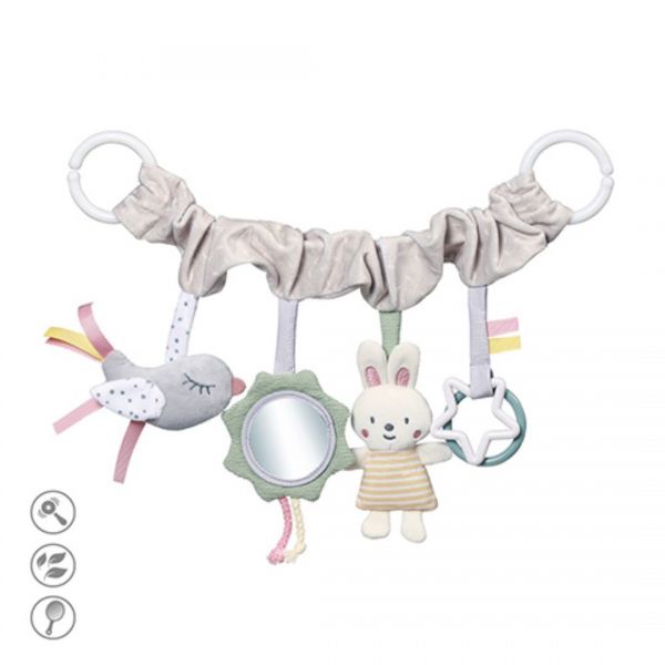 Αυτό το μοναδικό παιχνίδι συνδυάζει κουδουνίστρα, καθρέφτη, κορδελίτσες και μασητικά σε ένα πρακτικό κρεμαστό παιχνίδι! Ιδανικό για να κρεμαστεί όχι μόνο στο καρότσι, αλλά και στην κούνια, το παρκοκρέβατο ή το κάθισμα αυτοκινήτου. Με αυτό, οι βόλτες γίνονται πιο διασκεδαστικές και το μωρό σας απασχολείται δημιουργικά.